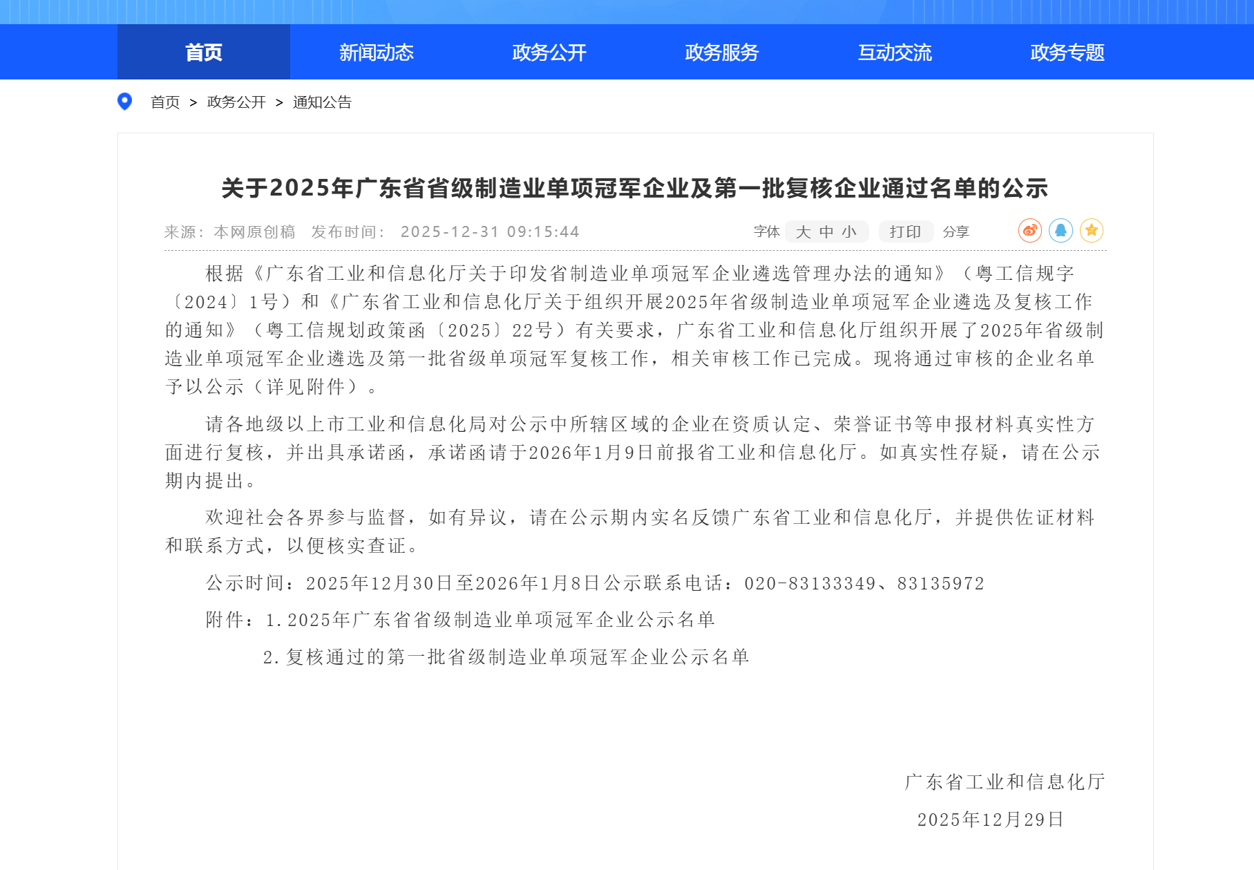 省級制造業(yè)單項冠軍企業(yè)復(fù)核通過