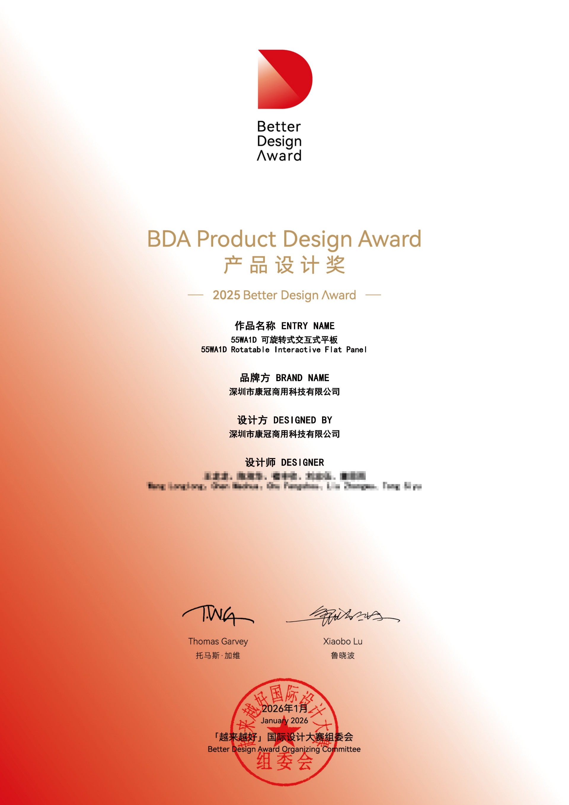 康冠科技旗下子公司康冠商用公司自主研發(fā)的“55WA1D 可旋轉(zhuǎn)式交互式平板”在工業(yè)設(shè)計領(lǐng)域脫穎而出,成功摘得2025“越來越好”設(shè)計獎(產(chǎn)品設(shè)計獎)。該產(chǎn)品憑借靈活的旋轉(zhuǎn)設(shè)計、流暢的交互體驗以及一體化智能辦公解決方案,獲得了評委會的高度評價。
